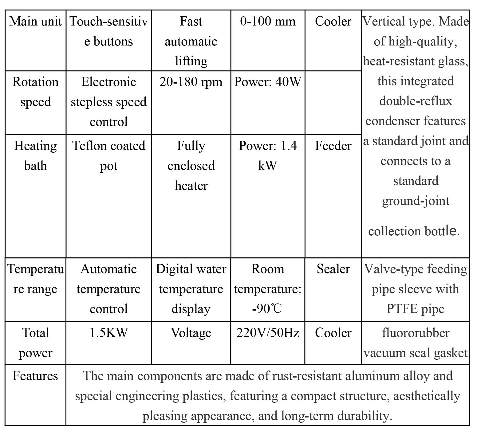 Evaporation tube: Made of high-quality high-temperature resistant glass and fluoroplastic composite. “Silicone-fluorine composite sealing rings” are used at both ends for good vacuum sealing. Long service life, and can be regularly removed for cleaning or replacement as needed.
