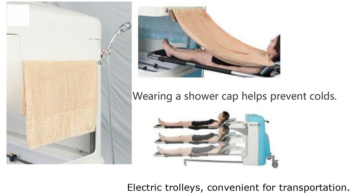 Safety precautions: Automatic water tank temperature monitoring and alarm, cold water pre-drainage, high and low water temperature threshold warnings, trolley battery capacity display, and bath towel coverage after bathing.